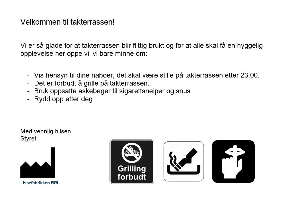 Styret har den siste tiden mottatt flere tilbakemeldinger på støy, lyden bærer ekstra godt med vinduer/dører åpne og på balkonger/takterrasse. Ønsker i den forbindelse bare å minne om husordensregler og regler for bruk av takterrassen.