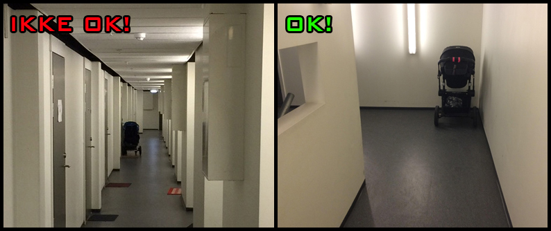 Eksempler på ikke-godkjent (Tar opp alt for mye plass i gangen), og godkjent plassering av barnevogn (God plass til å passere). (Husk å søke til styret!)